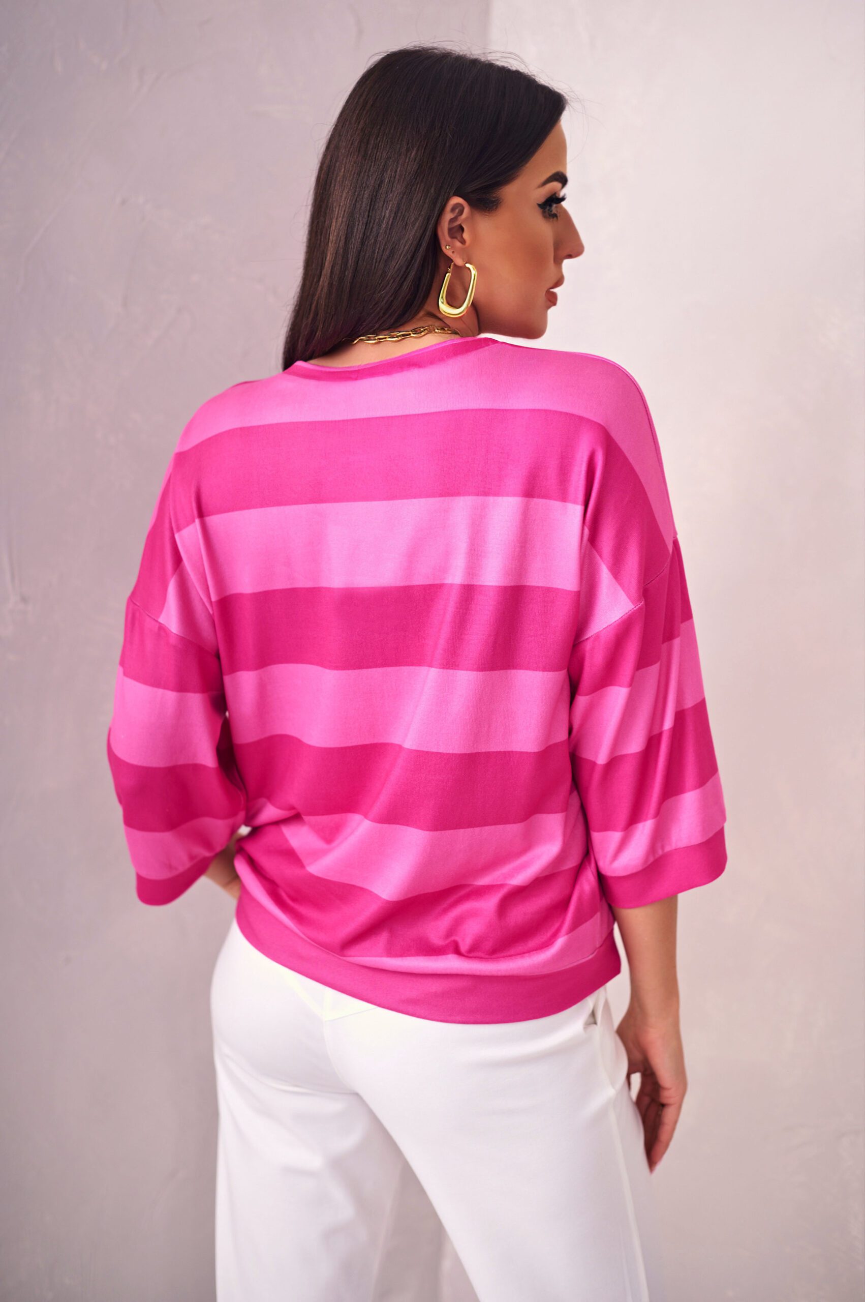 Bluzka damska z rękawem ⅞. Idealna do wiosennych stylizacji. Jej znakiem rozpoznawczym są szerokie pasy nadrukowane na materiale. Połącz ją z dżinsami lub spódnicą tworząc wiosenny modny look.