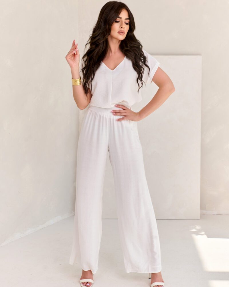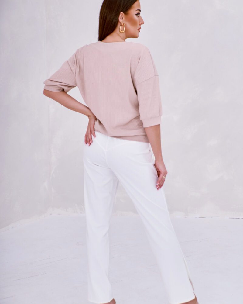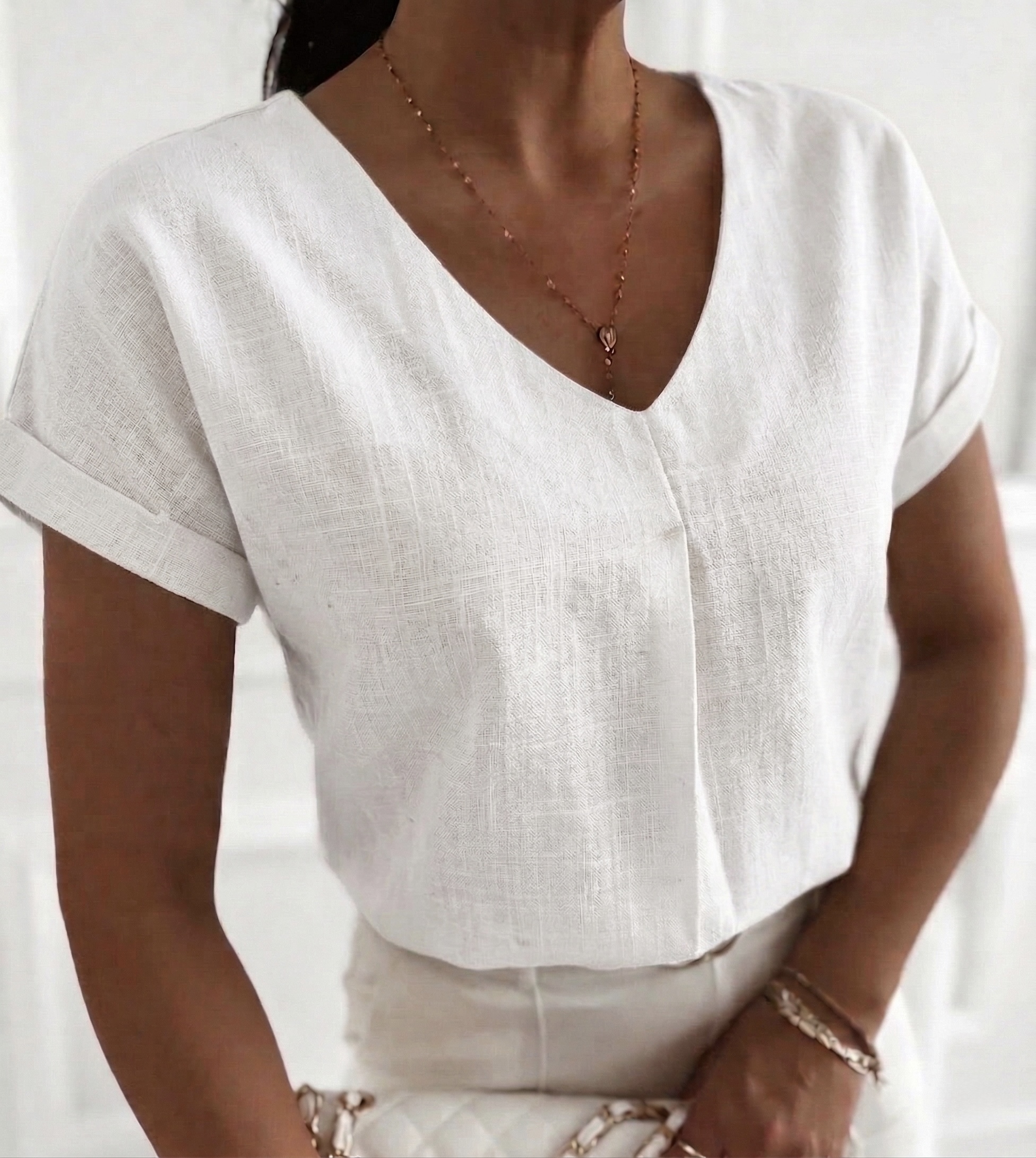 Bluzka damska z materiału a’la len, zwiewny, kreszowany. Dekolt w szpic świetnie wysmukla sylwetkę. Stwórz z nią modny look! Dostępne również inne produkty z tego materiału, kompletuj jak lubisz.